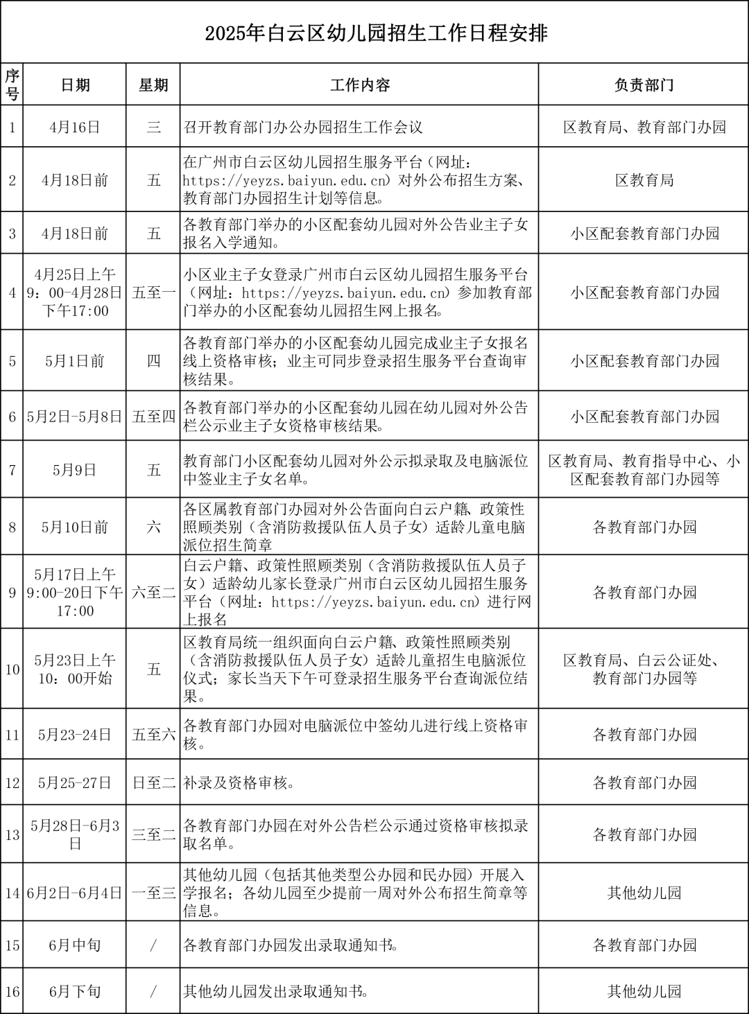 白云户籍和符合政策性照顾类别适龄儿童,参加区属教育部门办幼儿园电脑派位网上报名时间为5月17日至5月20日(星期六至星期二)。由幼儿父(母)或其他法定监护人,在规定时间内登录广州市白云区幼儿园招生服务平台(网址:https://yeyzs.baiyun.edu.cn),进行实名制注册后完成网上报名。